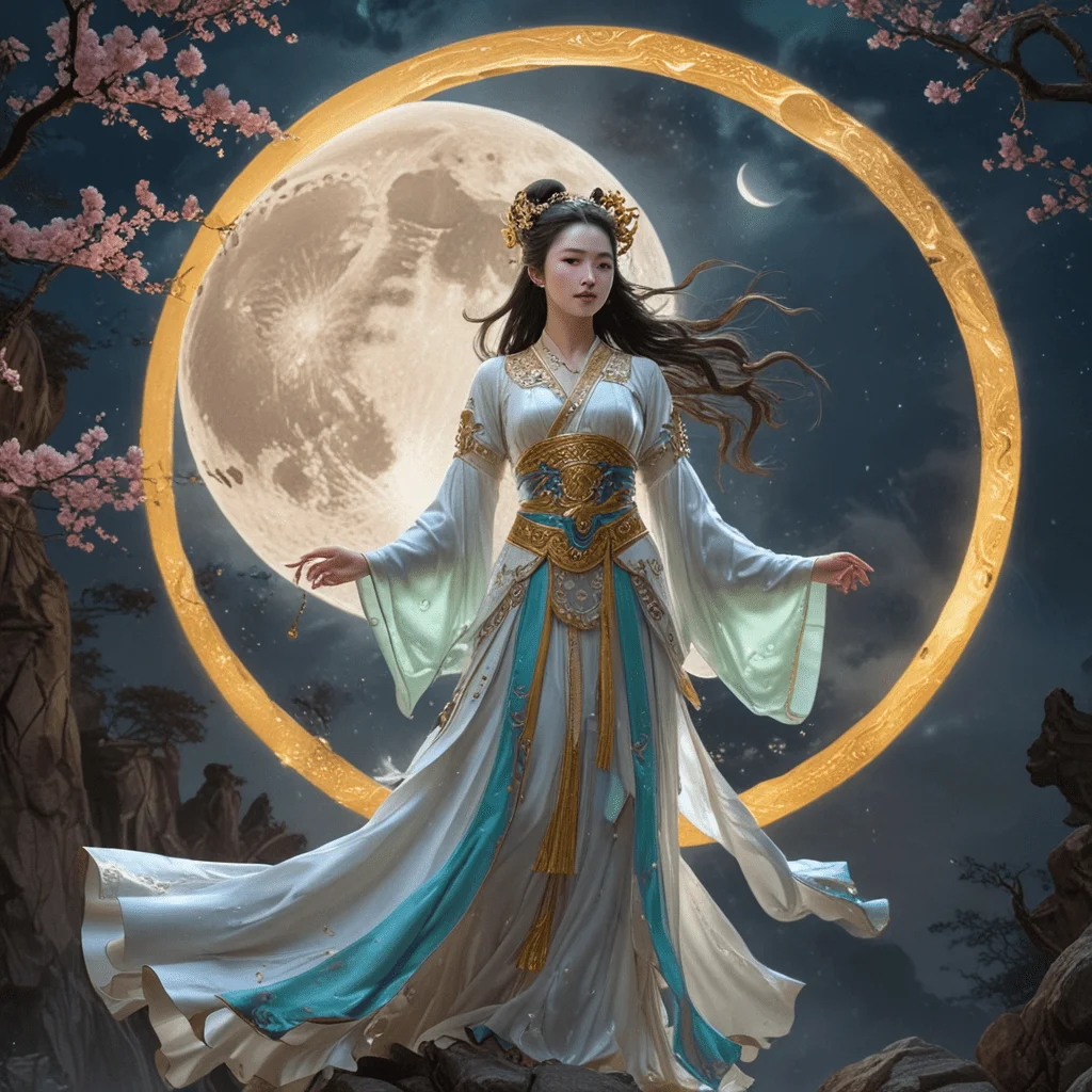 She loved her husband Houyi very much, but her curiosity and longing for the sky were so great that, after some hesitation, she took the drops. After a short time, she was overcome by a feeling of lightness. It didn't take long before she lifted off the ground and began to ascend into the sky.