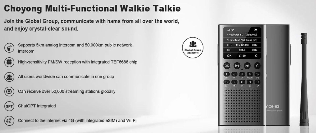 A walkie-talkie for DXing—a world receiver for radio transmission—an Internet radio that you can even control with your own voice, a globally available chat function—all this and much more in a single small device. With the WT2, Choyong has brought a truly amazing product to the market. Apart from its rather weak sensitivity in the medium wave range, the WT-2 is extremely powerful. It is, so to speak, an all-in-one device: world receiver, walkie-talkie, internet radio, chat tool, MP3 player, alarm clock, recording device, and more. All this variety in a single device—that's a world first. At any rate, I haven't seen anything like it anywhere else yet. It fits perfectly into Choyong's product range.