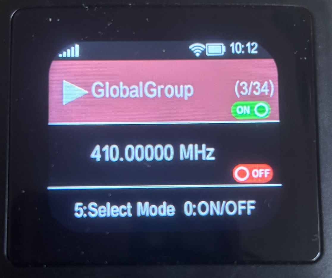 The frequency range for analog voice radio is between 400,000 and 465,000 MHz. The frequency can be freely selected. You can also easily define your own intermediate frequencies. Use the 5 key to switch between the two functions. Use the 0 key to activate or deactivate the respective system. To use analog voice radio, Bluetooth and Wi-Fi must be turned off. To speak, press the PTT button (and hold it down while speaking).